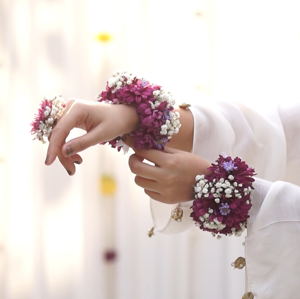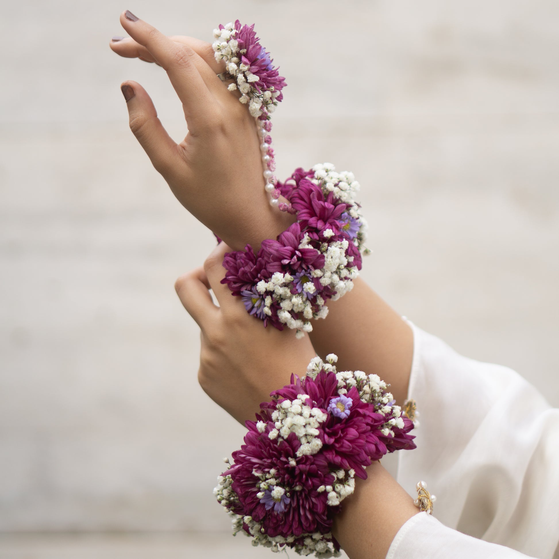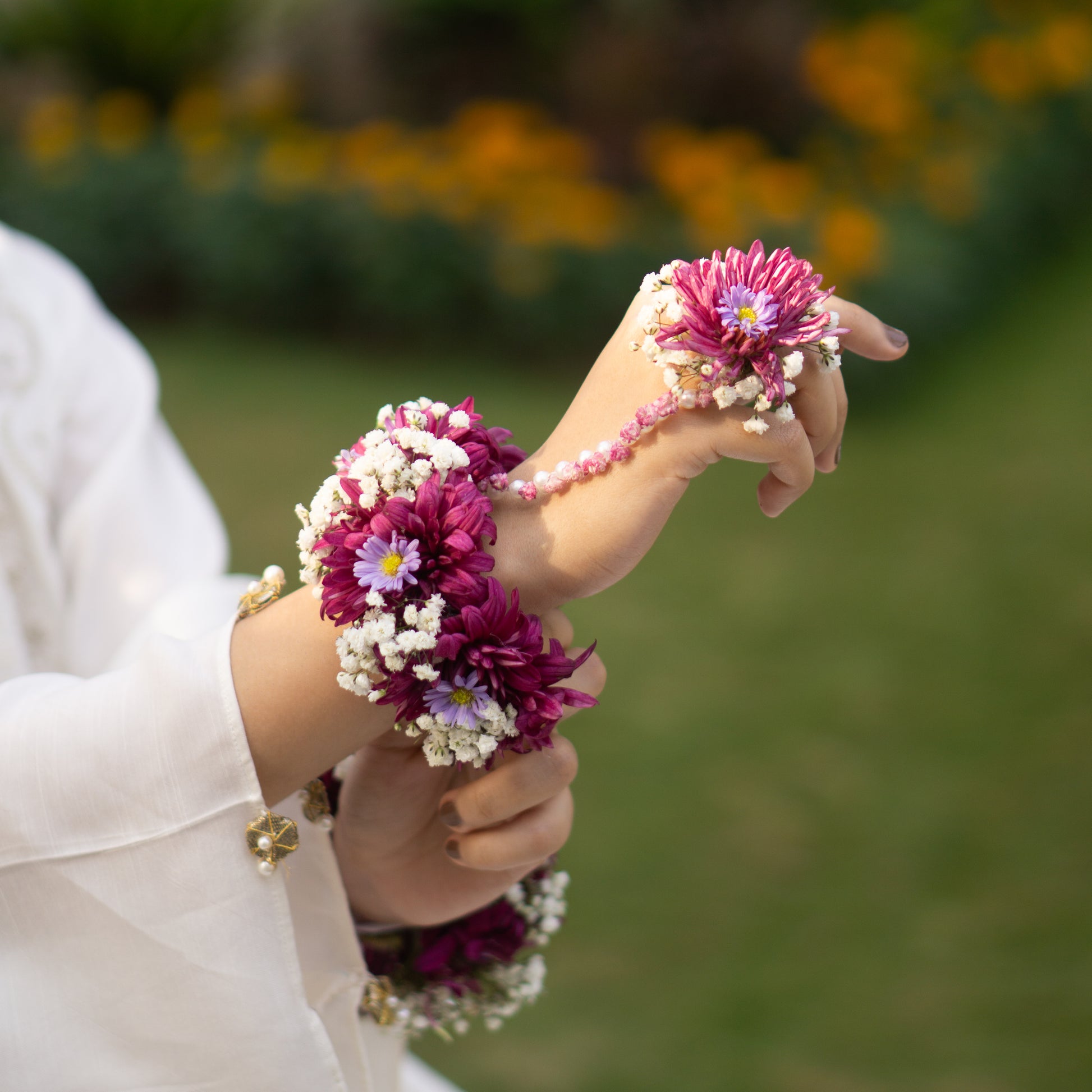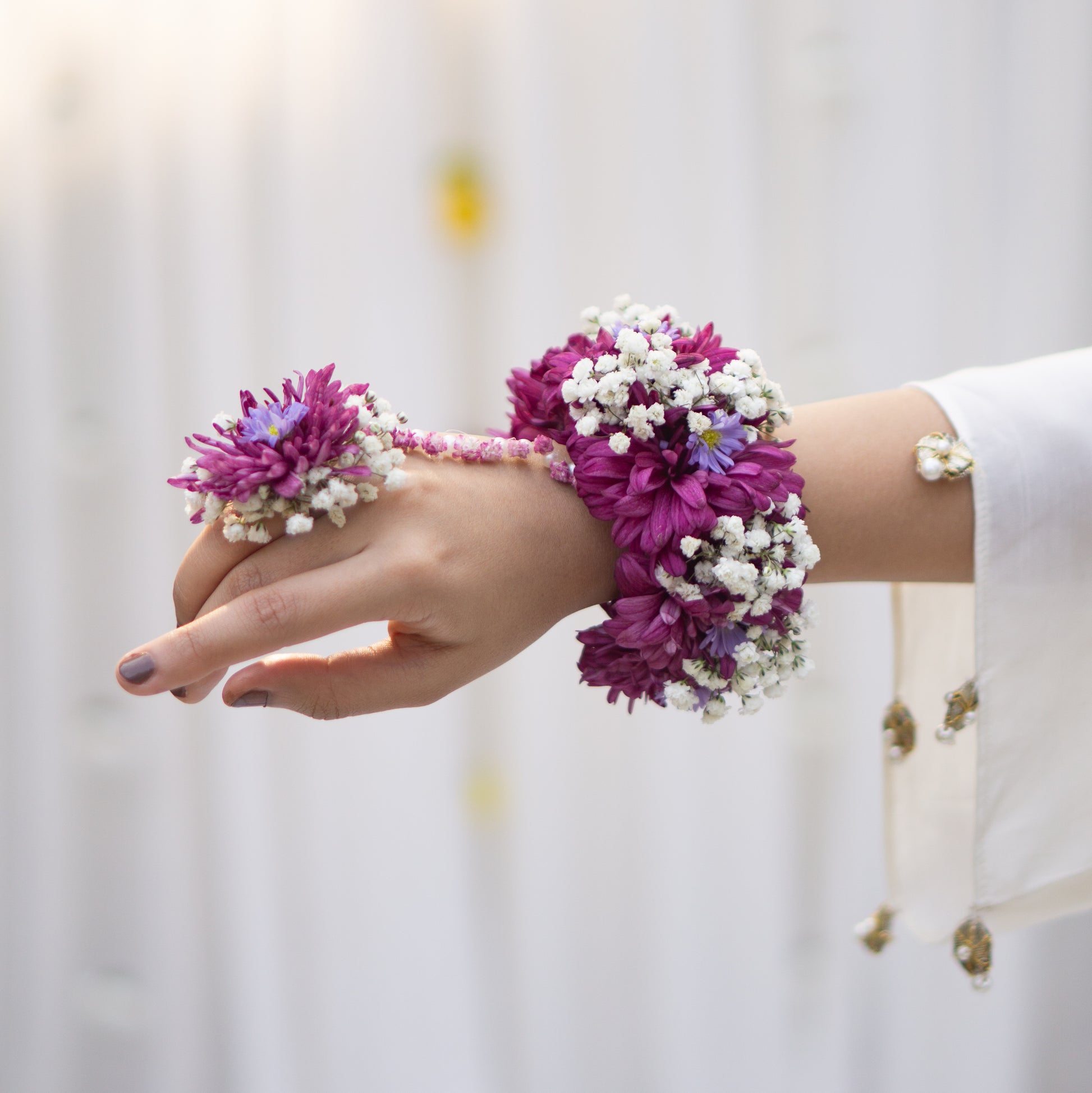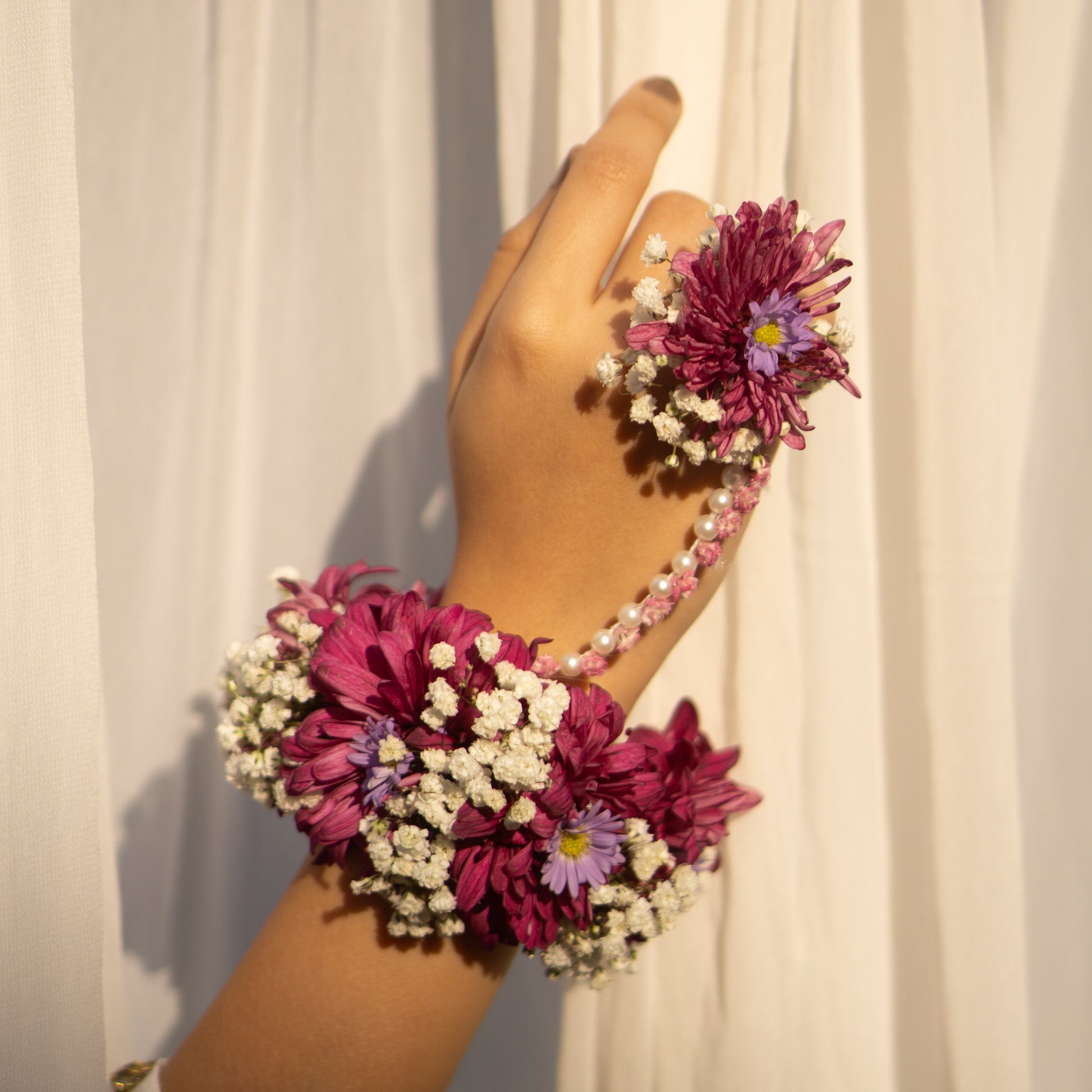 An exquisite handcrafted adornment that blends floral artistry with fine jewelry elegance. This gajra-inspired hand piece features lush purple chrysanthemums, delicate white baby’s breath, and vibrant purple asters, all arranged to create a regal, feminine silhouette. The floral strand gracefully connects to a coordinating ring, forming a seamless bloom-to-finger design that feels both opulent and ethereal.