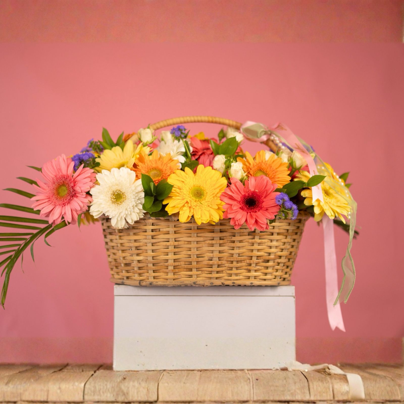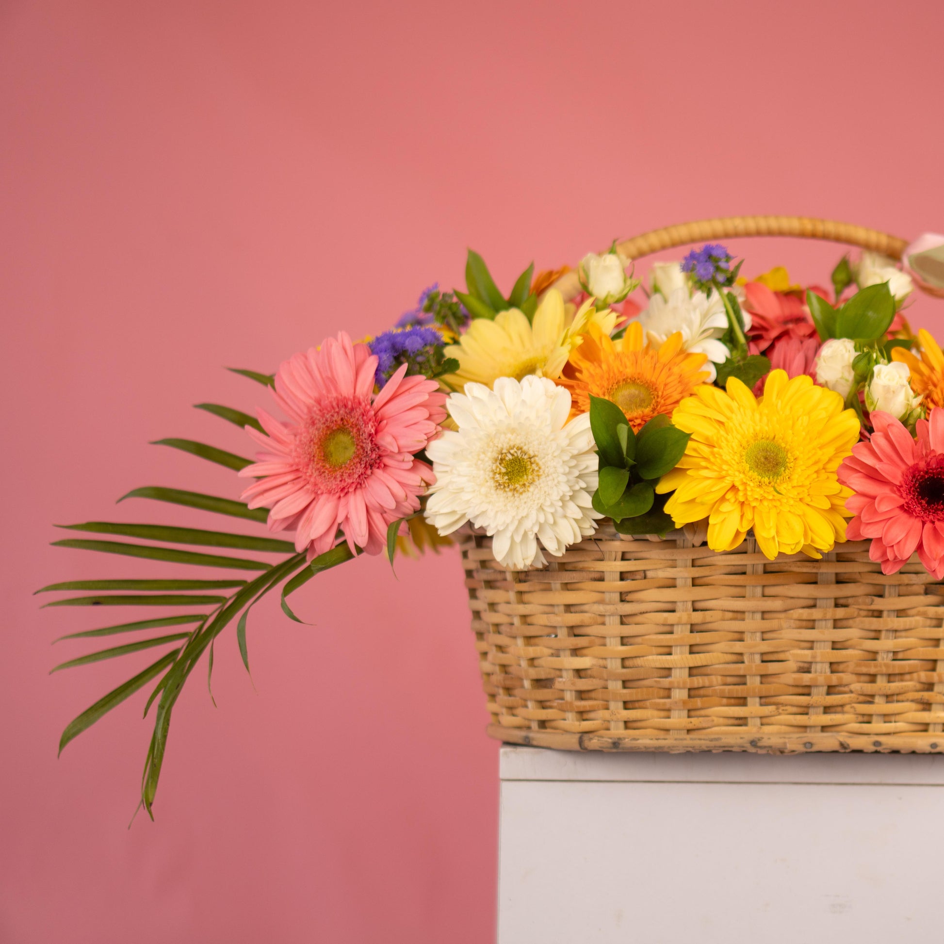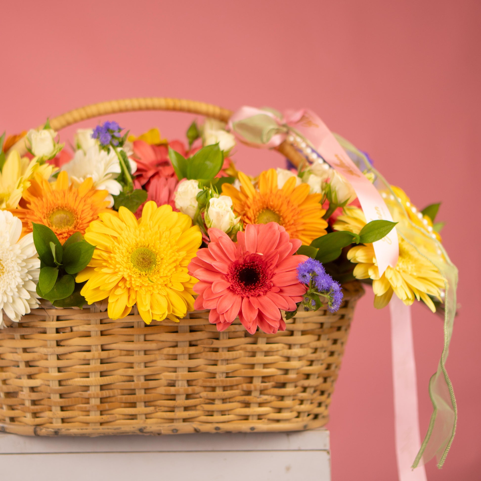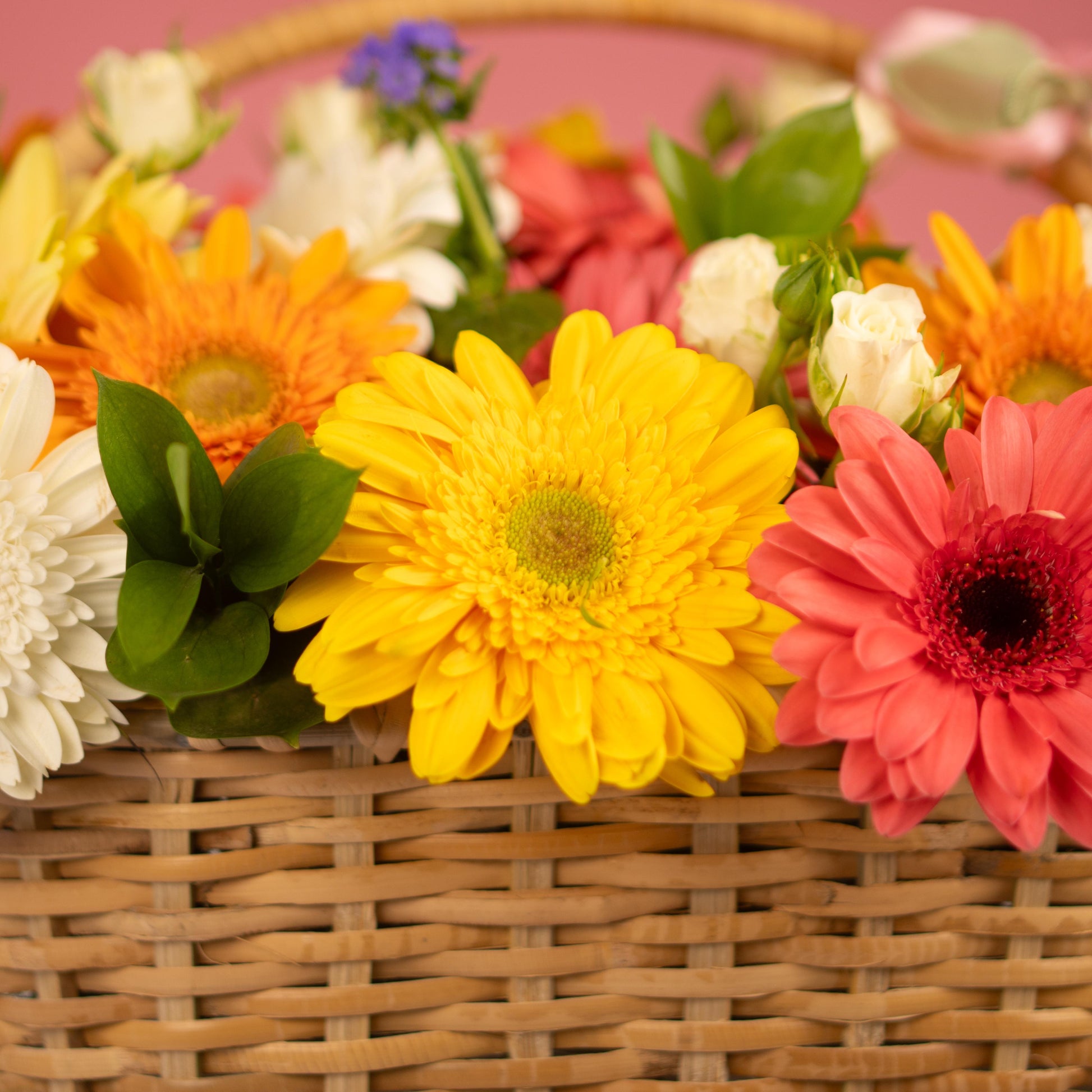 A joyful blend of multi-shaded gerberas, airy white spray roses, and soft purple ageratum.