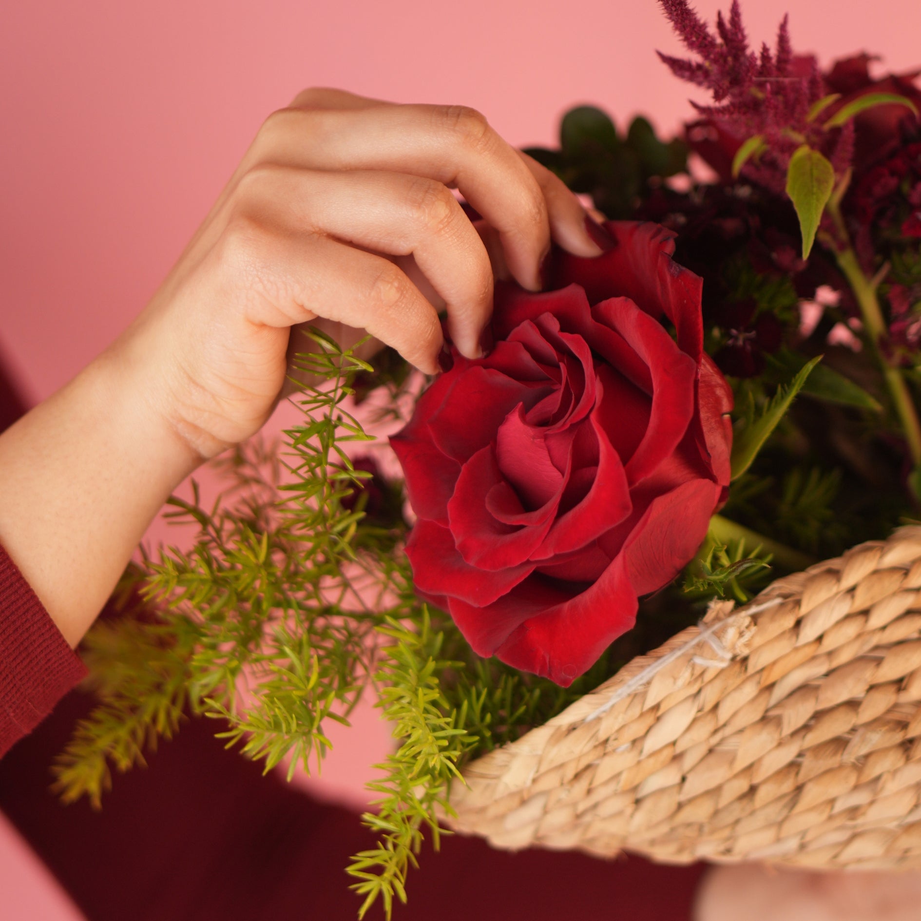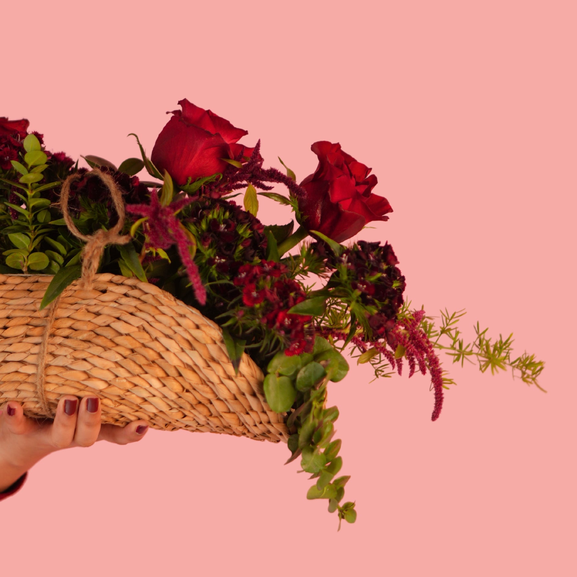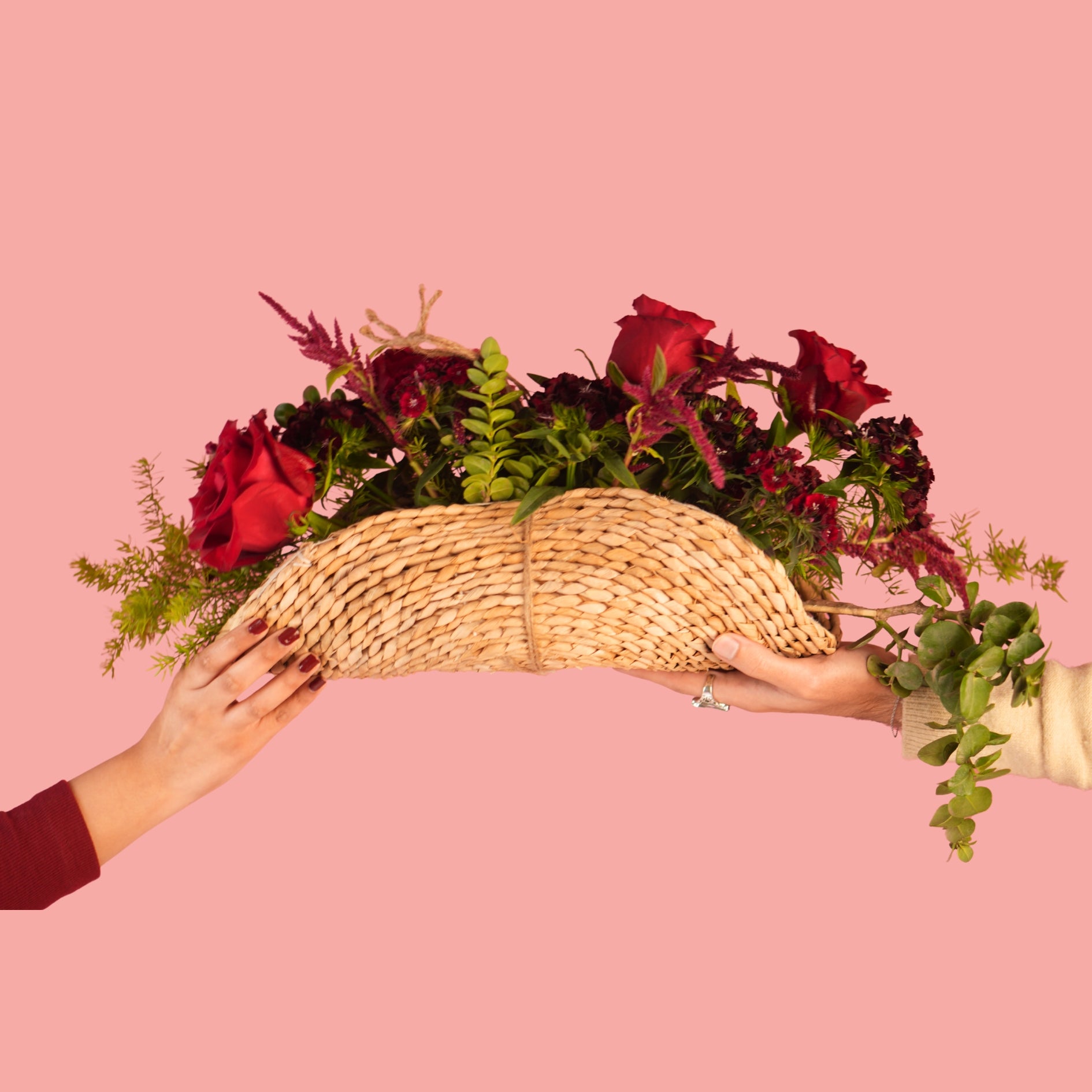 All red — reimagined in taco form. Designed on a light handwoven cane mat, this arrangement features lush red roses, farm-grown dianthus, red amaranths, and layered foliage. Perfect for foodies, romantics, and those who love classic flavours served with a modern twist bold, familiar, and full of feeling.