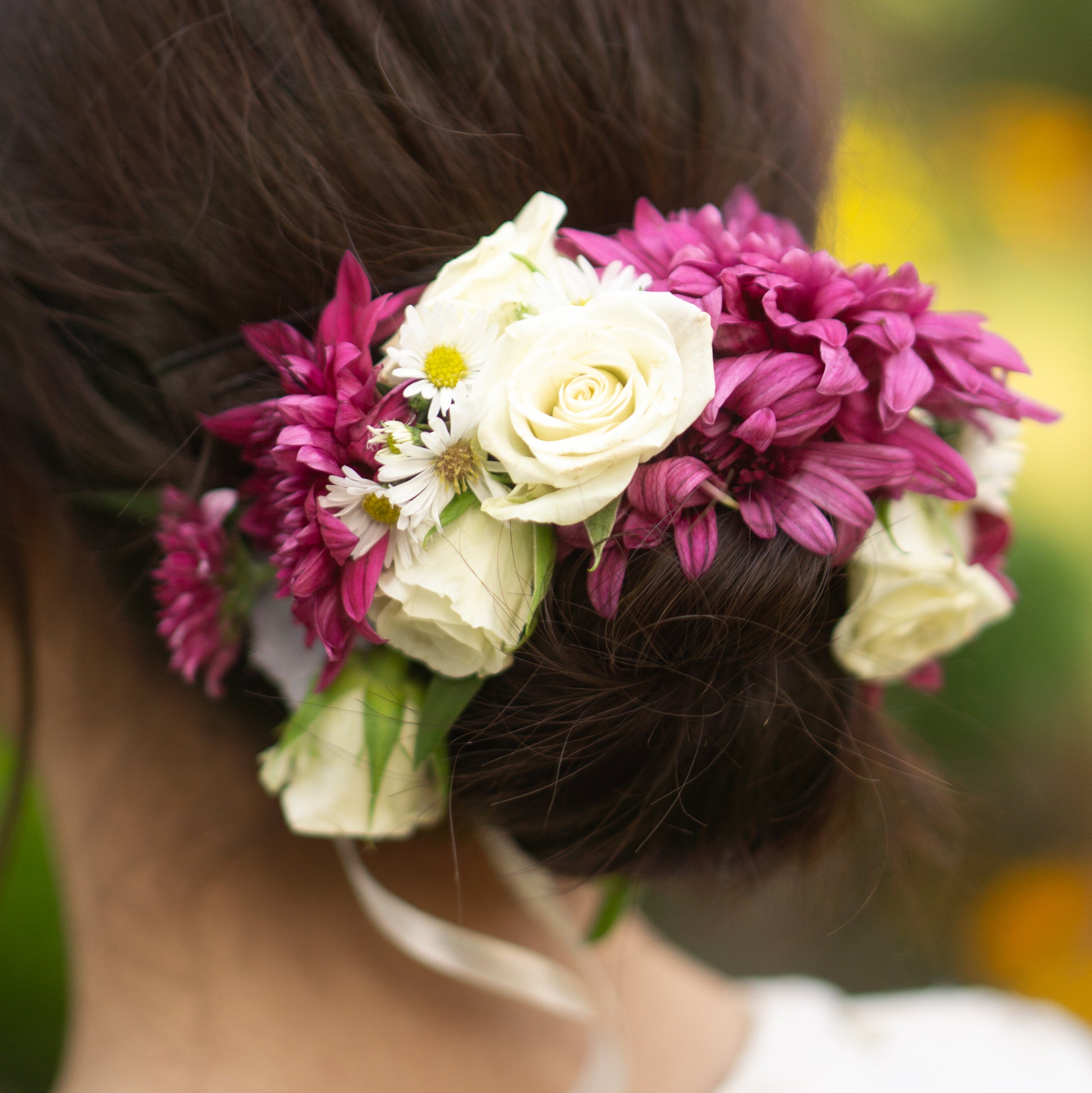 A delicately handcrafted hair adornment that exudes elegance and timeless beauty. This exquisite piece features a harmonious blend of purple chrysanthemums, rich purple asters, soft white baby’s breath, graceful white spray roses, and pristine white asters all arranged to create a refined, ethereal floral composition.