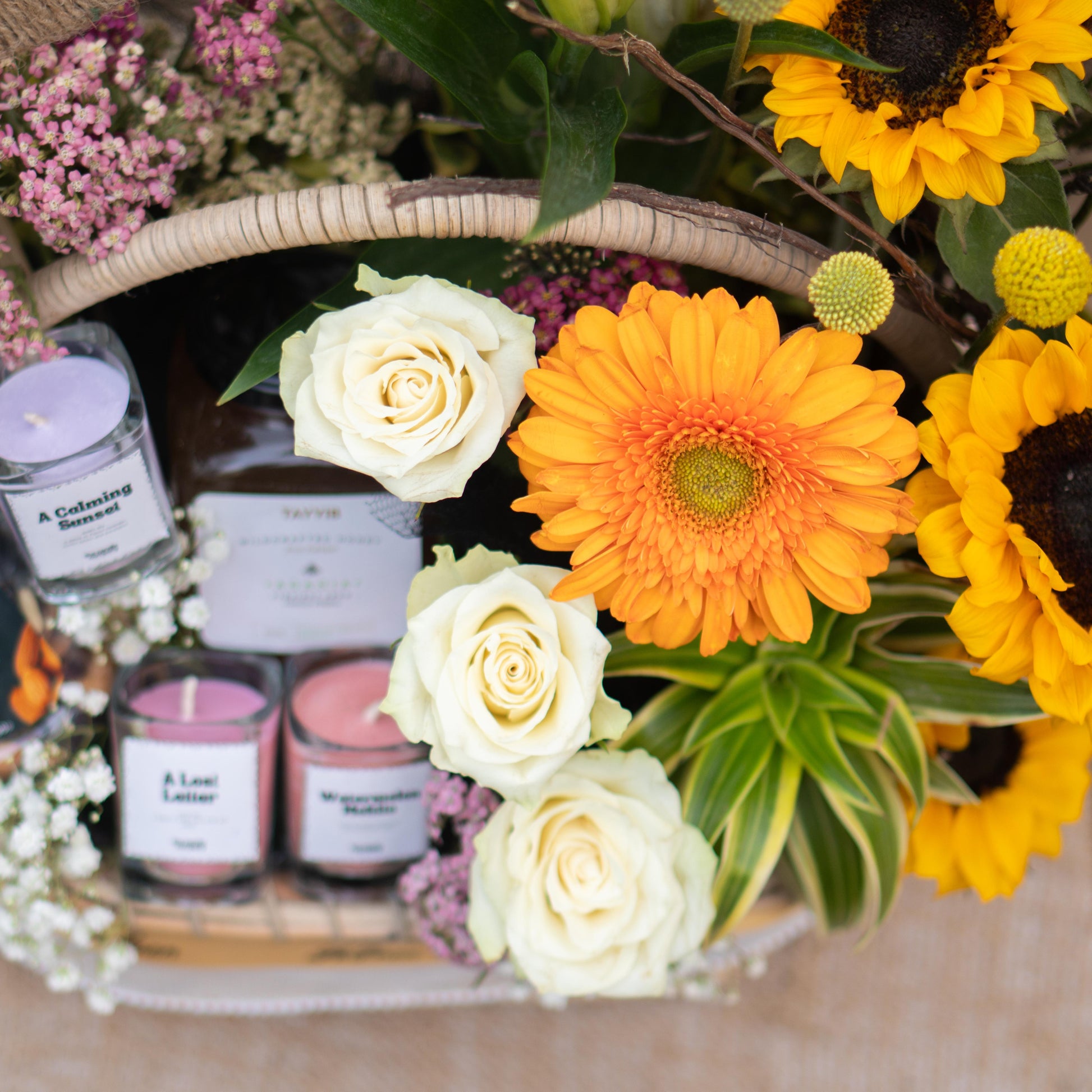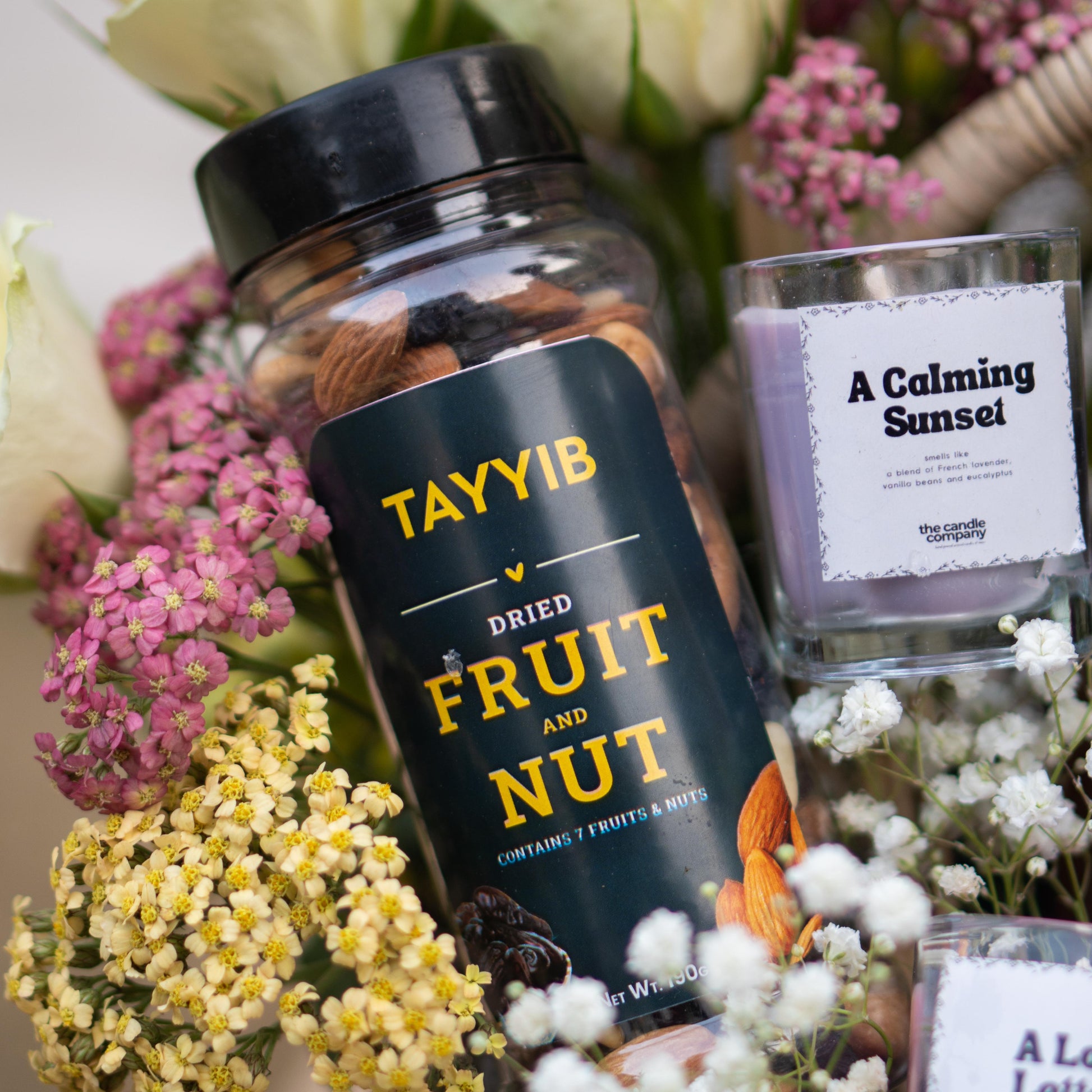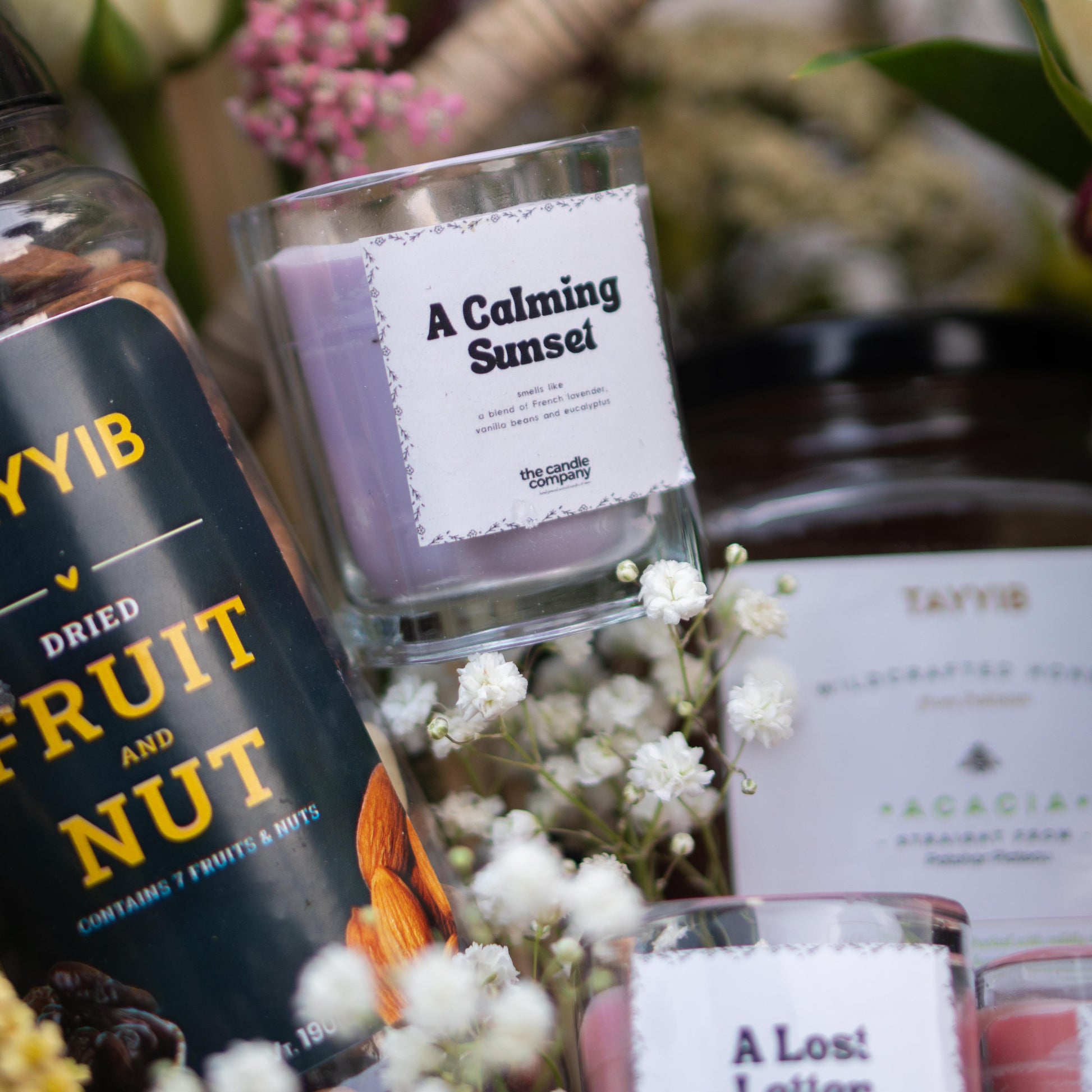 Finished with mini candles, dried fruits, nuts, and golden honey — a basket designed to glow through sacred nights and shared iftars.