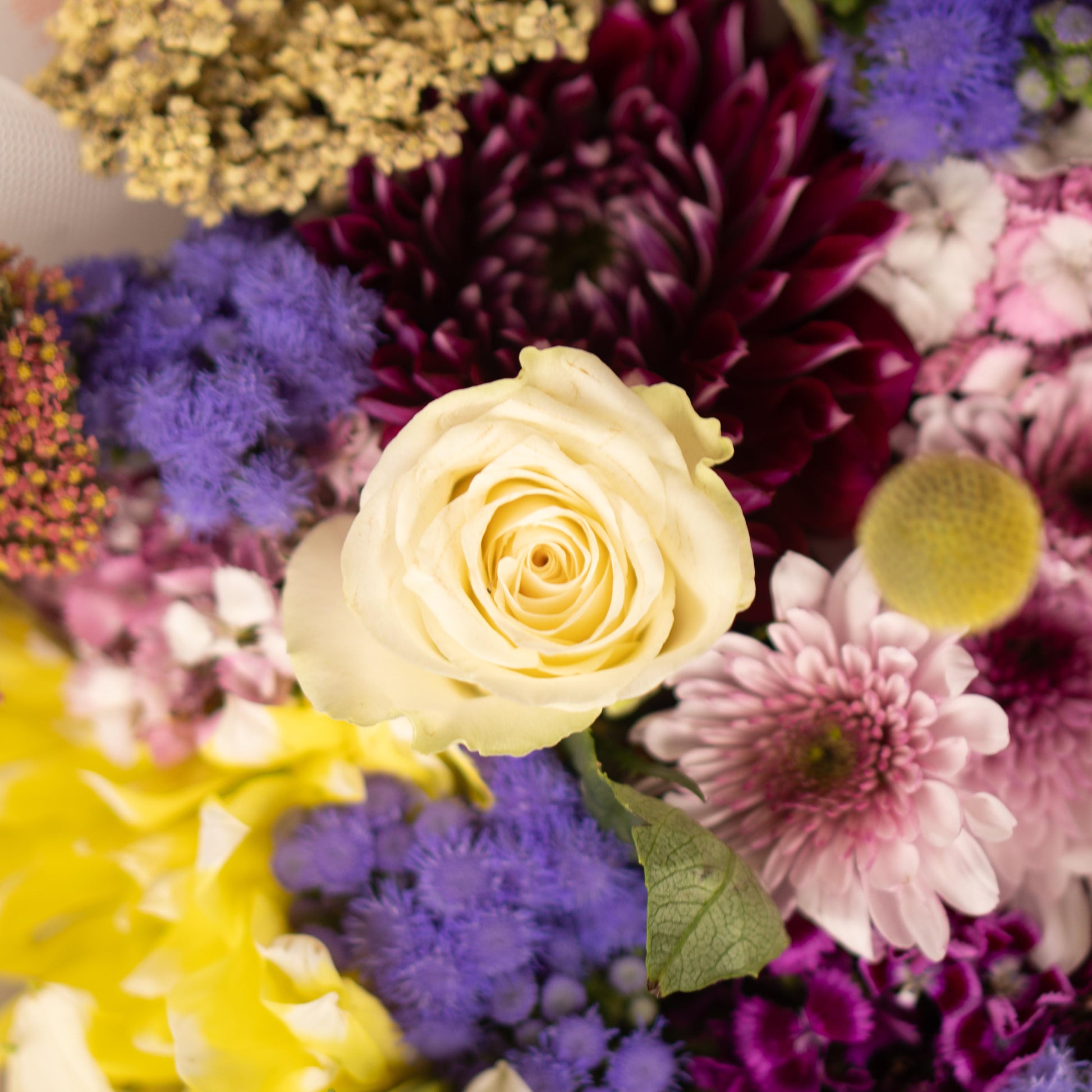 White roses and lilies meet lilac tones, double-shaded blooms, and golden craspedia accents.