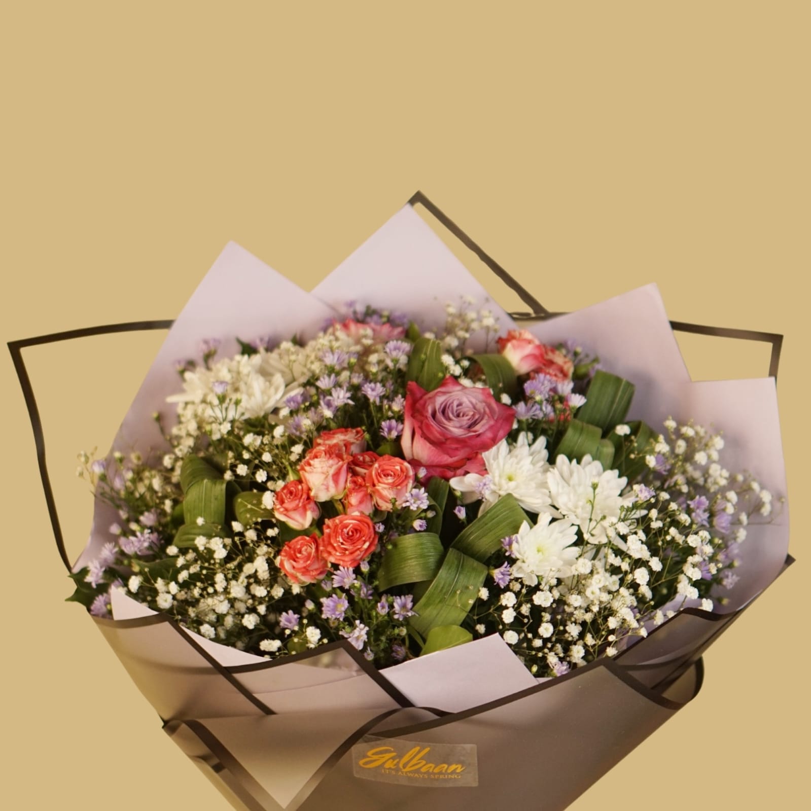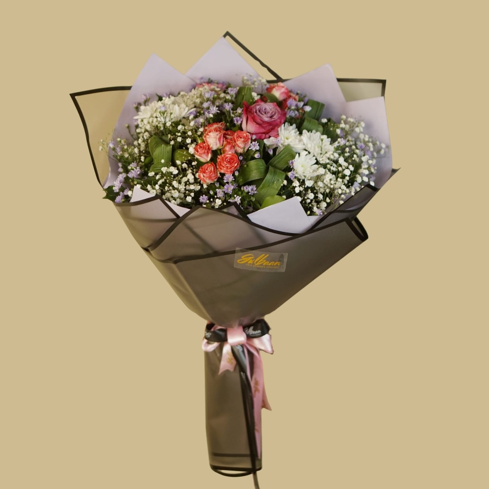 A gentle sprinkle of baby’s breath adds a dreamy, cloud-like finish, while folded lush leaves lend structure and depth. Wrapped in a delicate lilac and transparent fancy sheet, this bouquet embodies both modern sophistication and classic romance.
