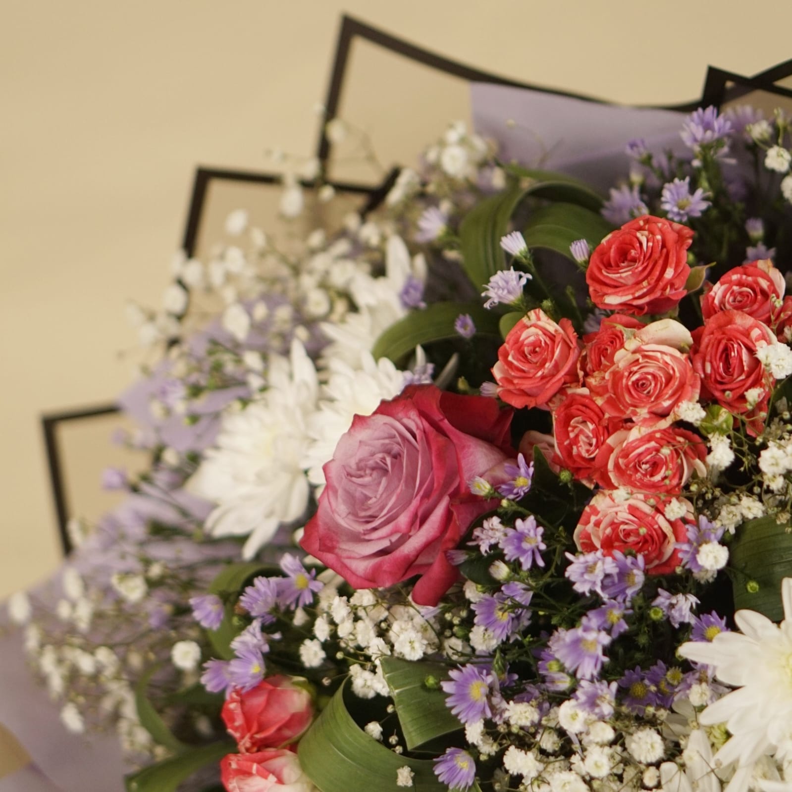 Step into a world of timeless beauty with Purple Rain, a bouquet designed to capture hearts with its deep yet delicate charm. This signature arrangement brings together double-shaded purple roses, symbolizing enchantment and admiration, alongside two-toned red spray roses, representing warmth and passion. The bouquet is further elevated with the soft elegance of lilac perennial asters and the serene purity of white chrysanthemums, creating a graceful balance of colors and textures.