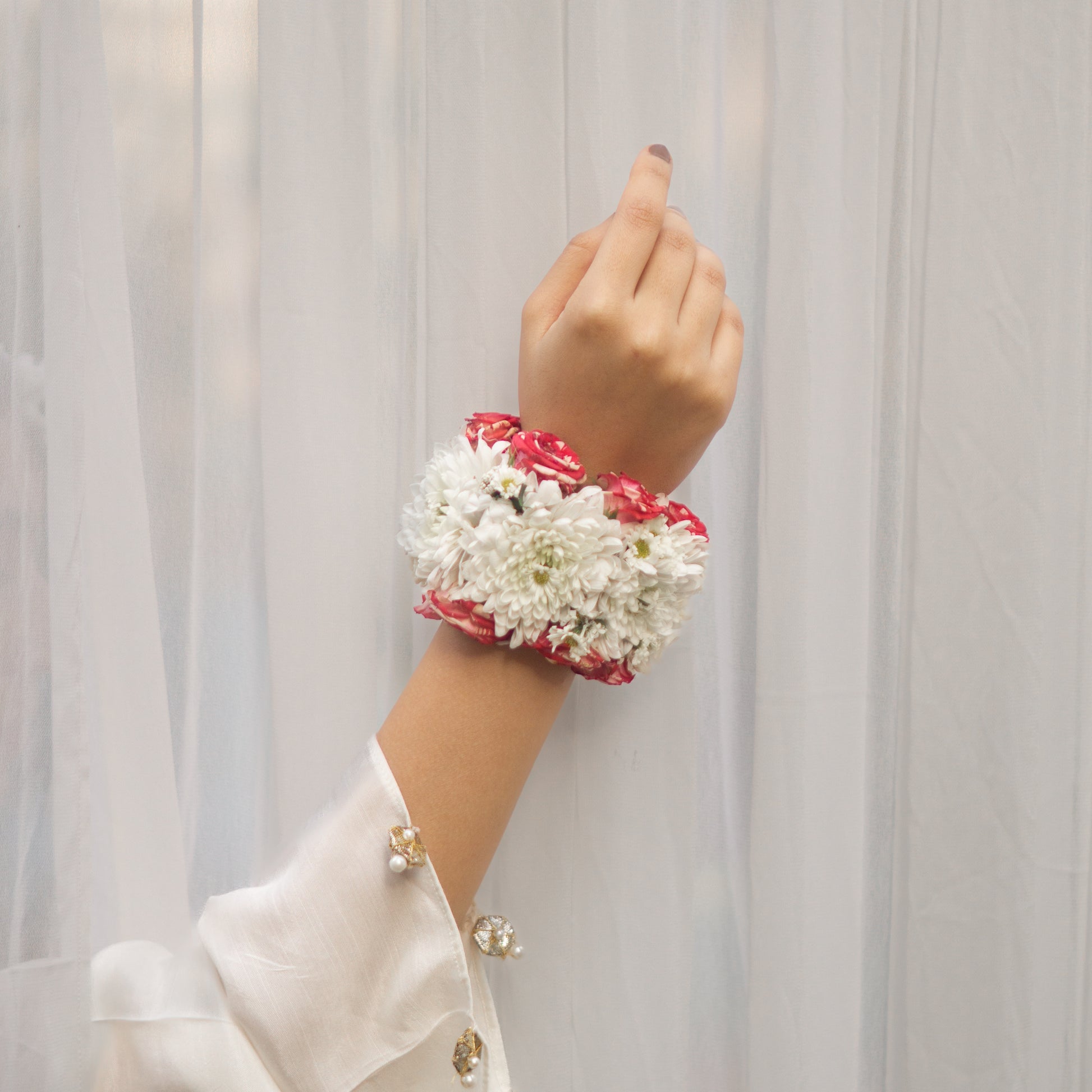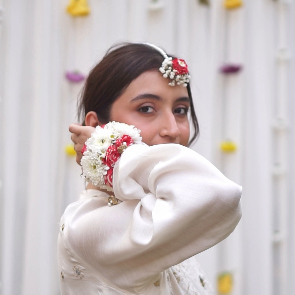 A timeless floral adornment crafted to embody elegance, tradition, and refined beauty. The gajra features vibrant red spray roses intertwined with white chrysanthemums and delicate gypso, creating a rich, romantic contrast that feels both classic and luxurious. Paired with it is a beautifully coordinated tikka, designed with red spray roses, airy white baby’s breath, and soft pearls that add a graceful touch of shimmer.