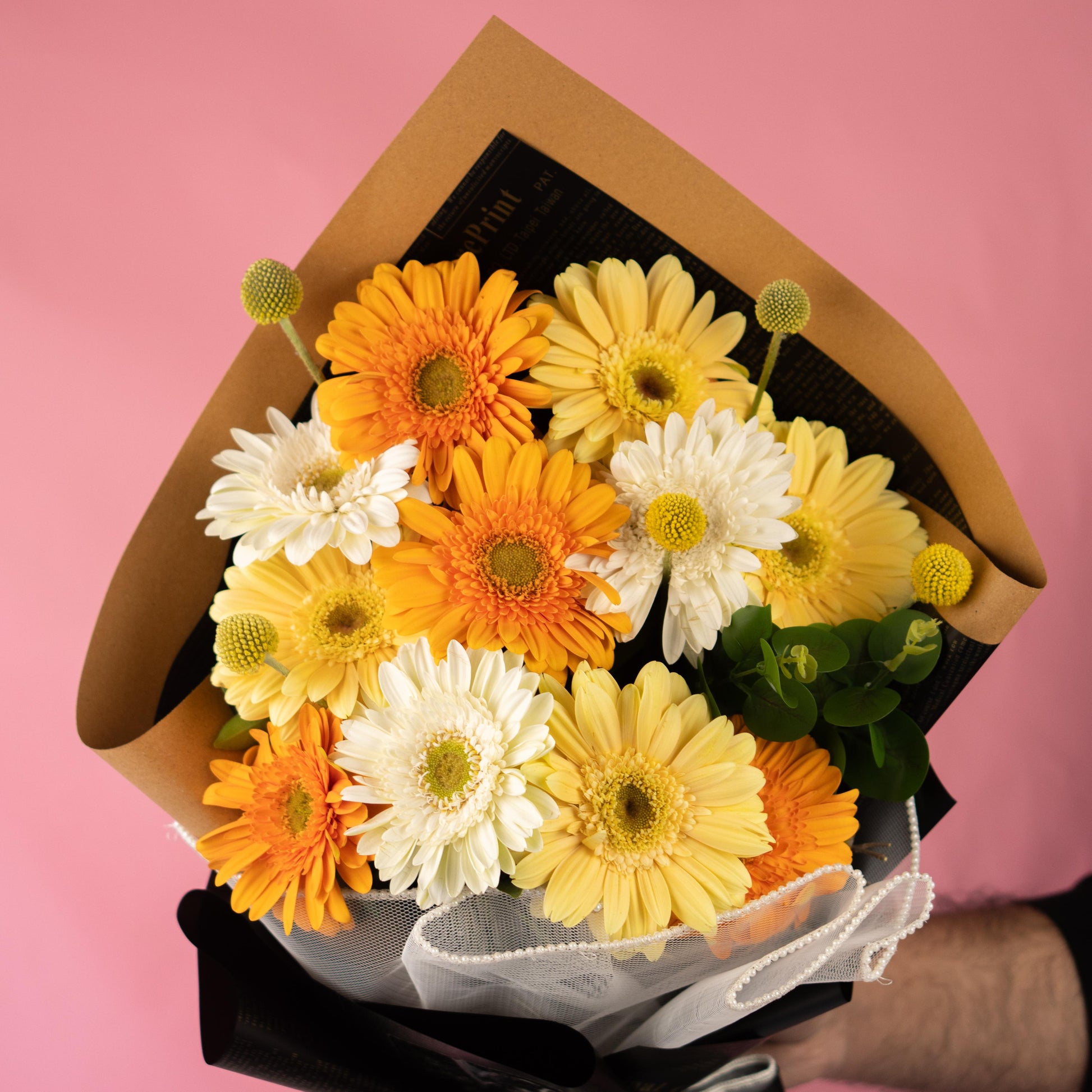 Craspedia and sunset-toned gerberas wrapped in delicate net with imported black and beige sheets for that modern edge.