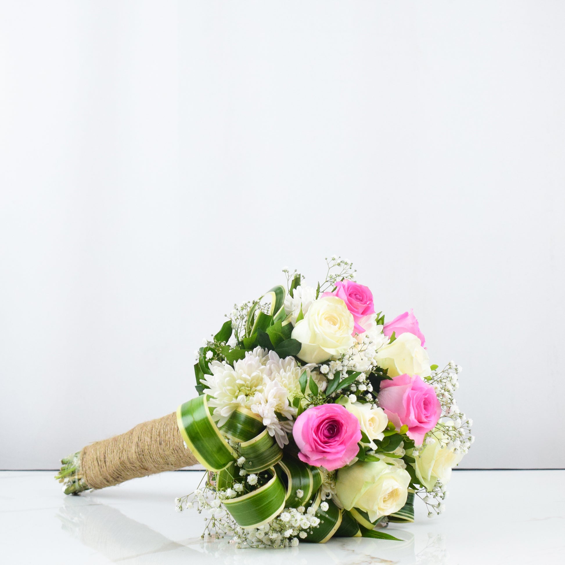 The ethereal beauty is forever complimented by the pearly white of the roses and Gypso. Encased in jute rope, this luxuriant bouquet highlights the subtle dewy blend.