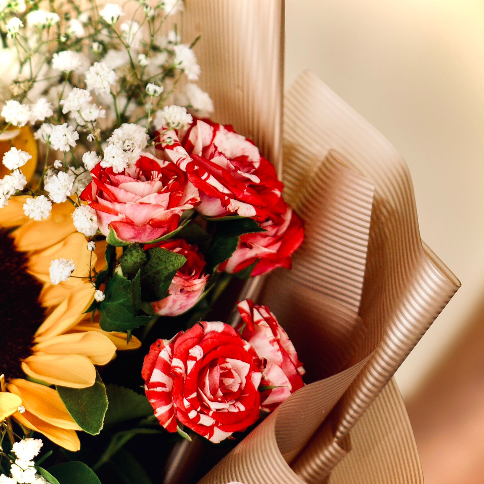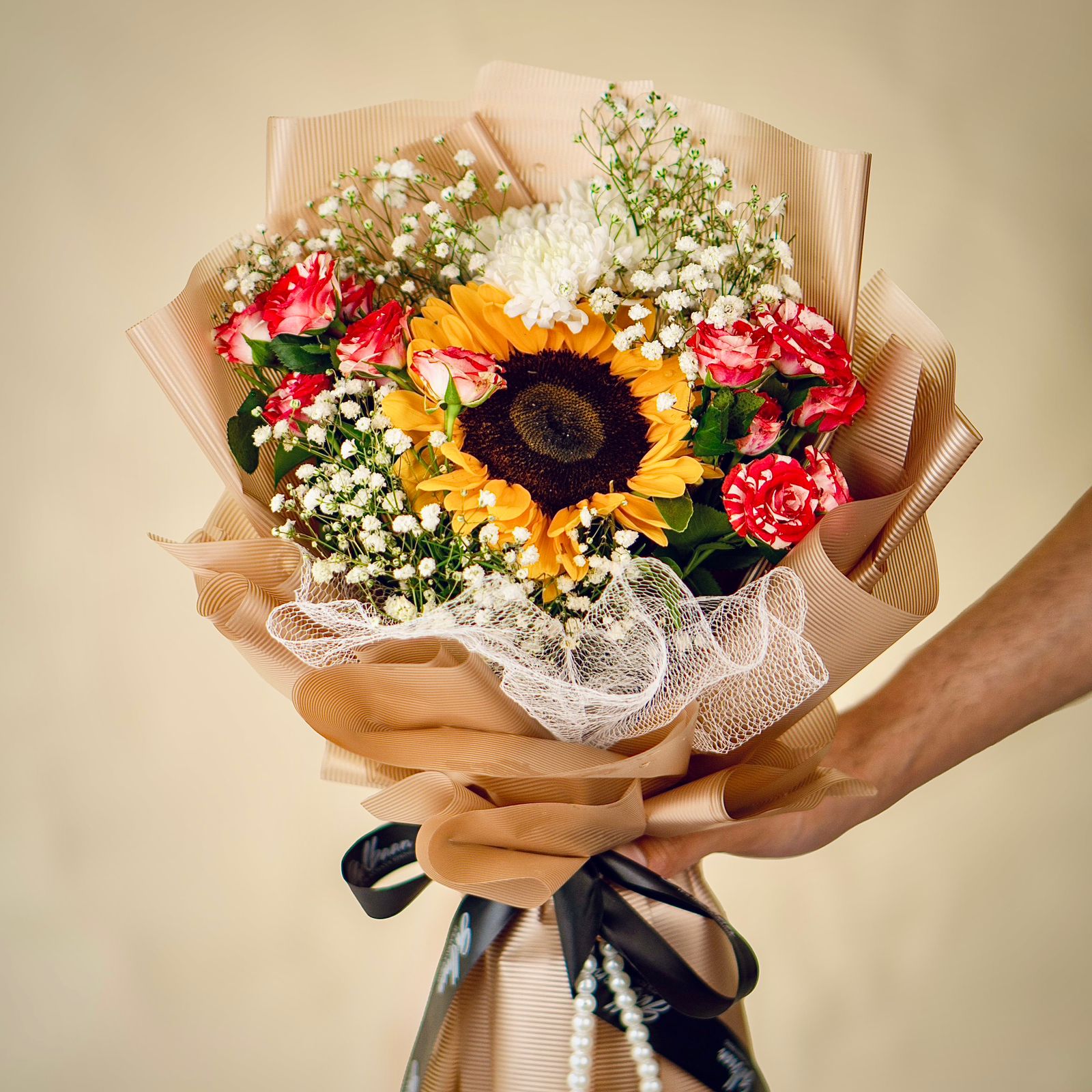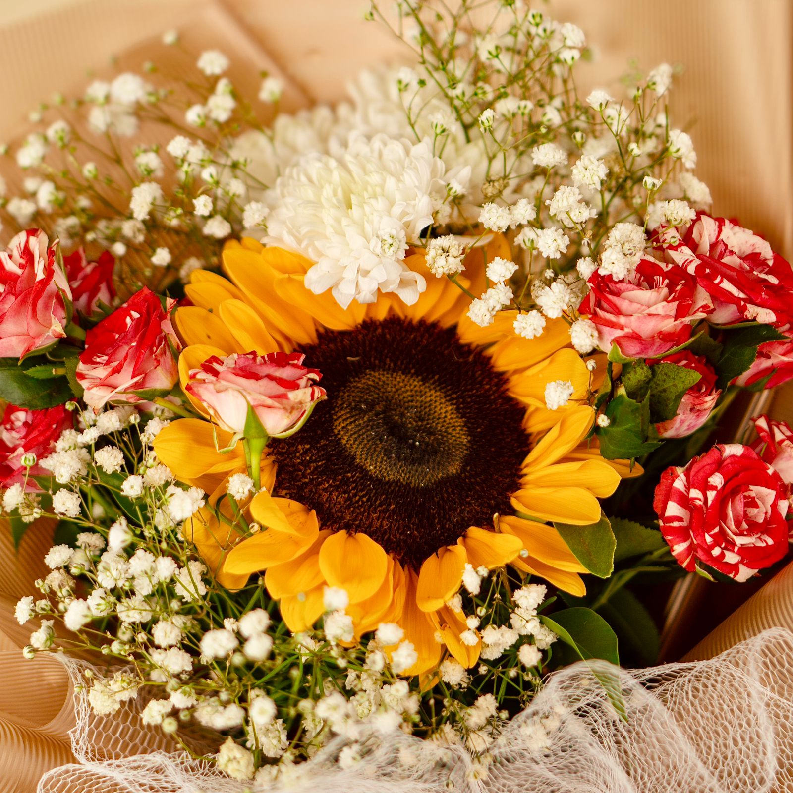 With a sunflower at its heart, lush red and white spray roses, white chrysanthemum and fluffy baby’s breath, and a net frill and pearls to match - this is the perfect warm gift to radiate light and positivity. ✨