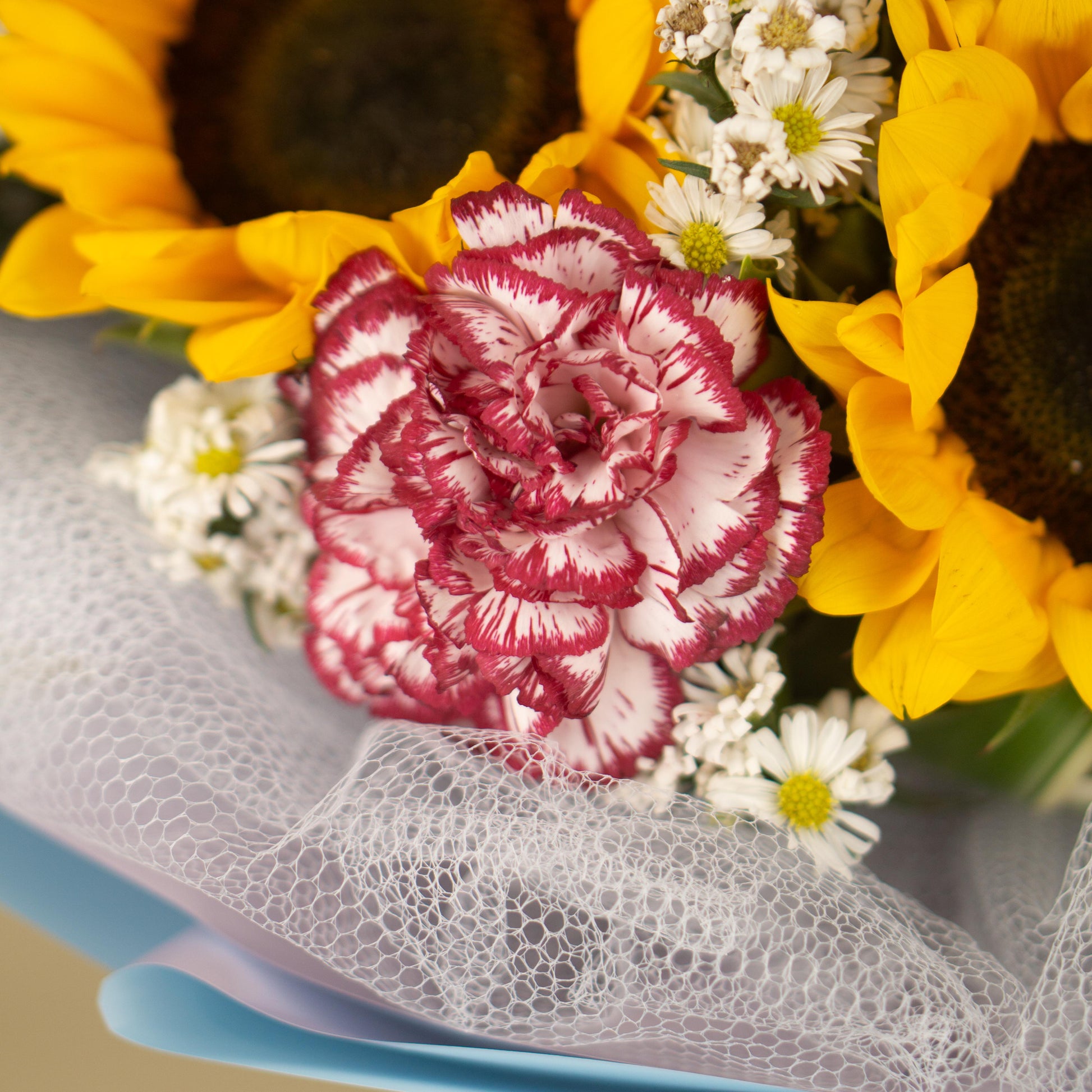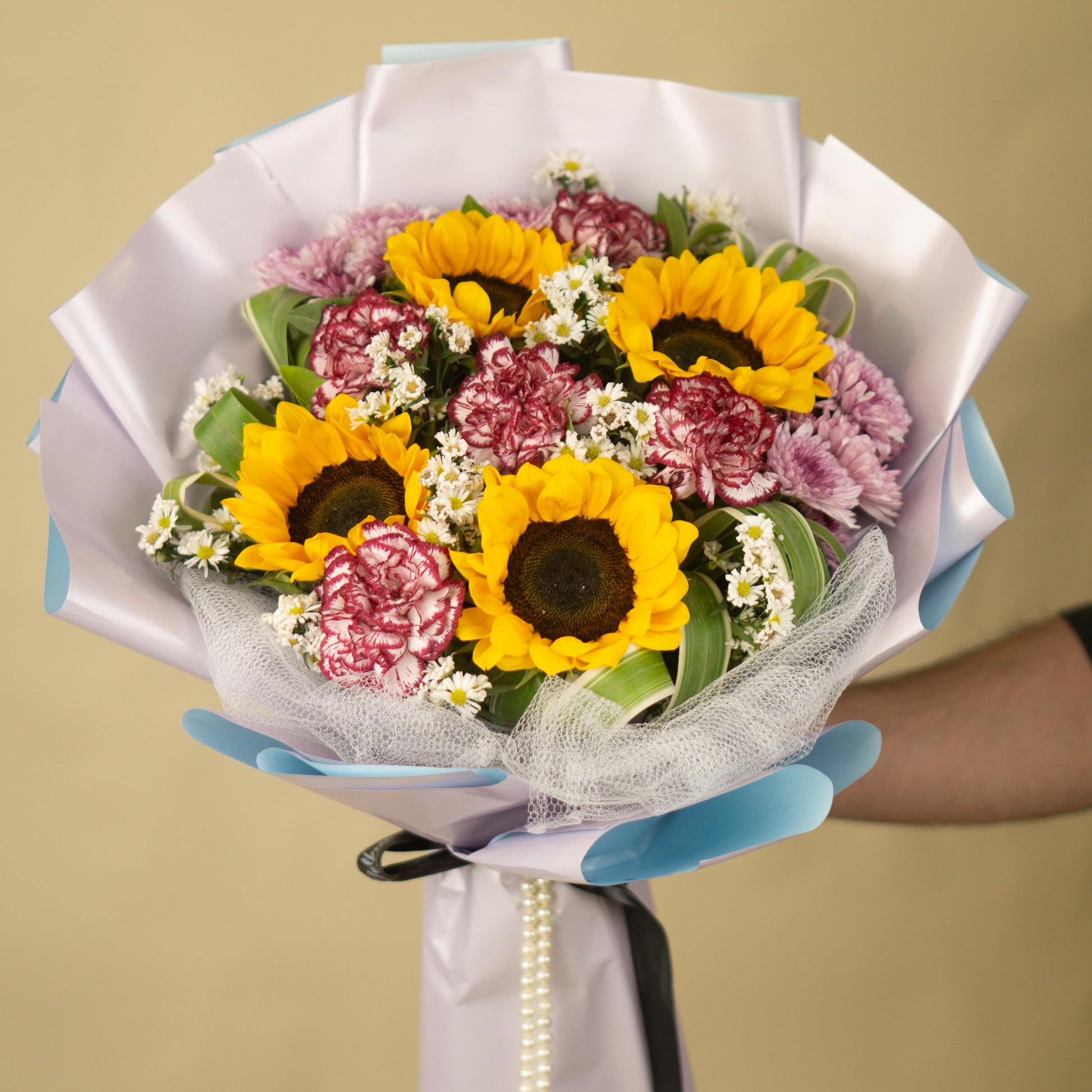 Golden sunflowers take centre stage with their warm, uplifting energy, while double-shaded lilac chrysanthemums and rich purple carnations add depth and drama. Soft white asters create a gentle, melodic contrast, and ribboned leaves weave in a graceful, contemporary finish.