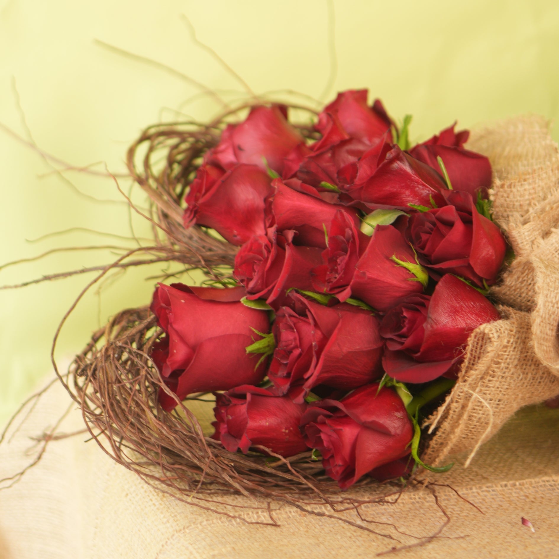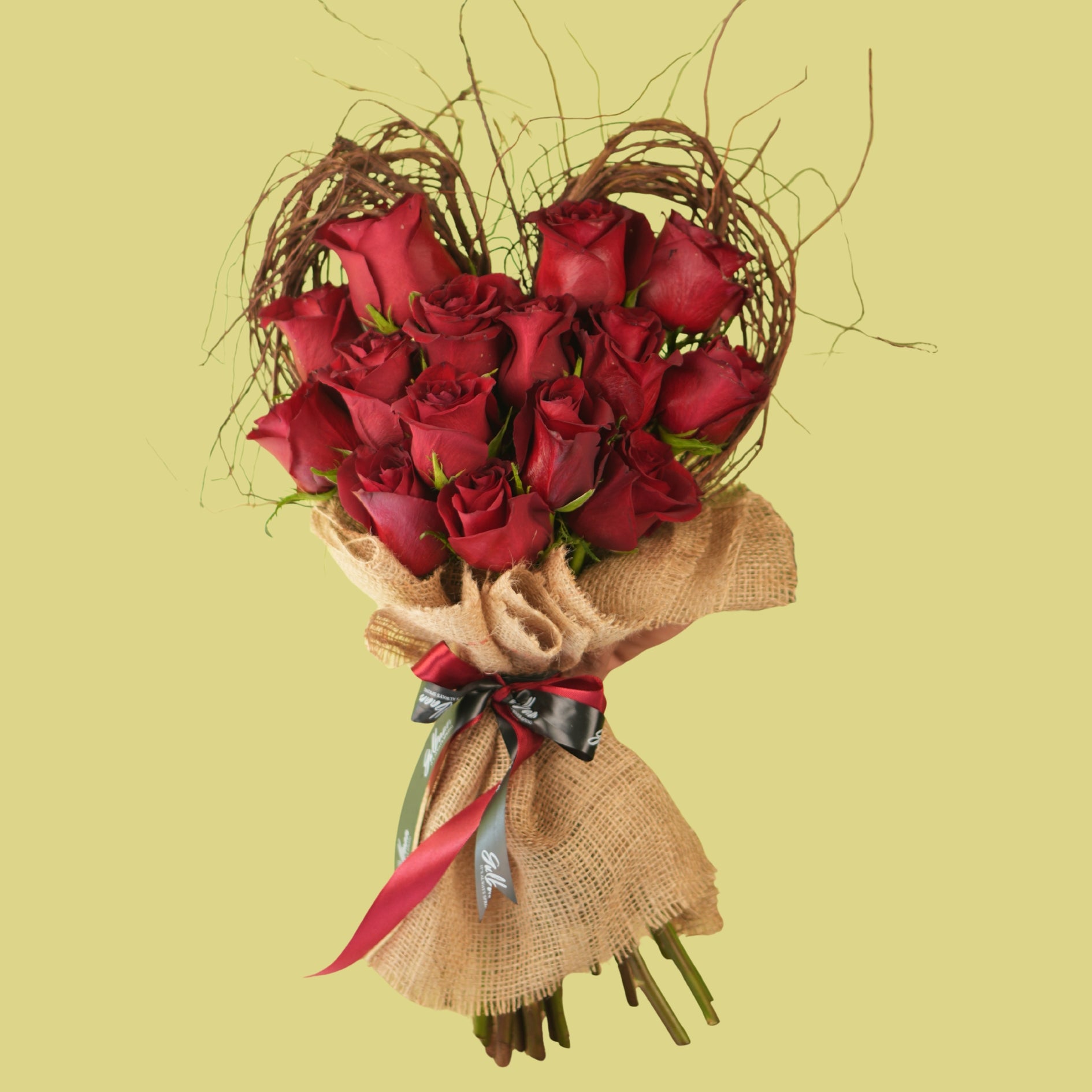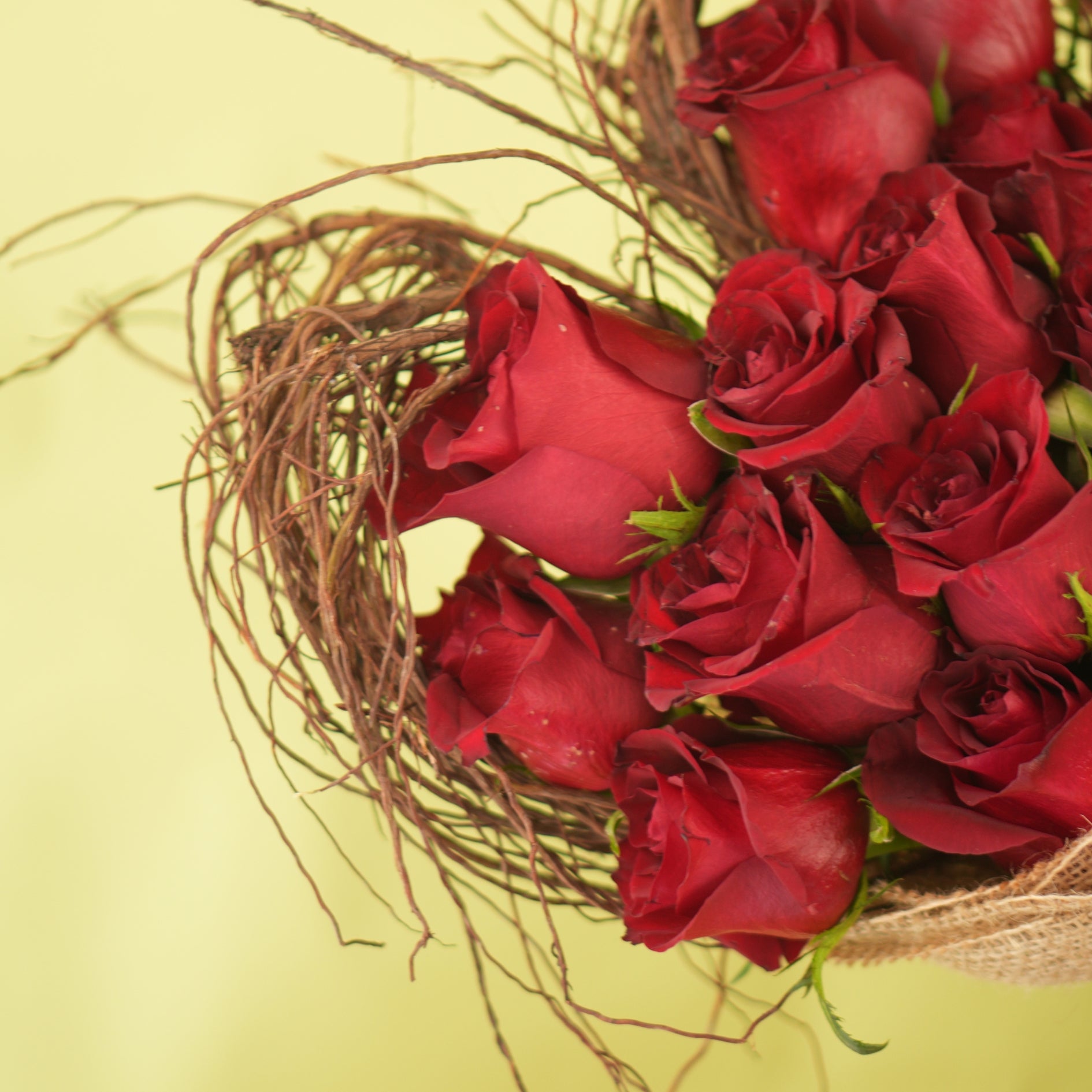 Untamed branches form this rugged heart shape, with 15 lush red roses grounding passion and creativity. Wrapped in jute and finished with a bold red ribbon, this arrangement is for free spirits and boundless love.