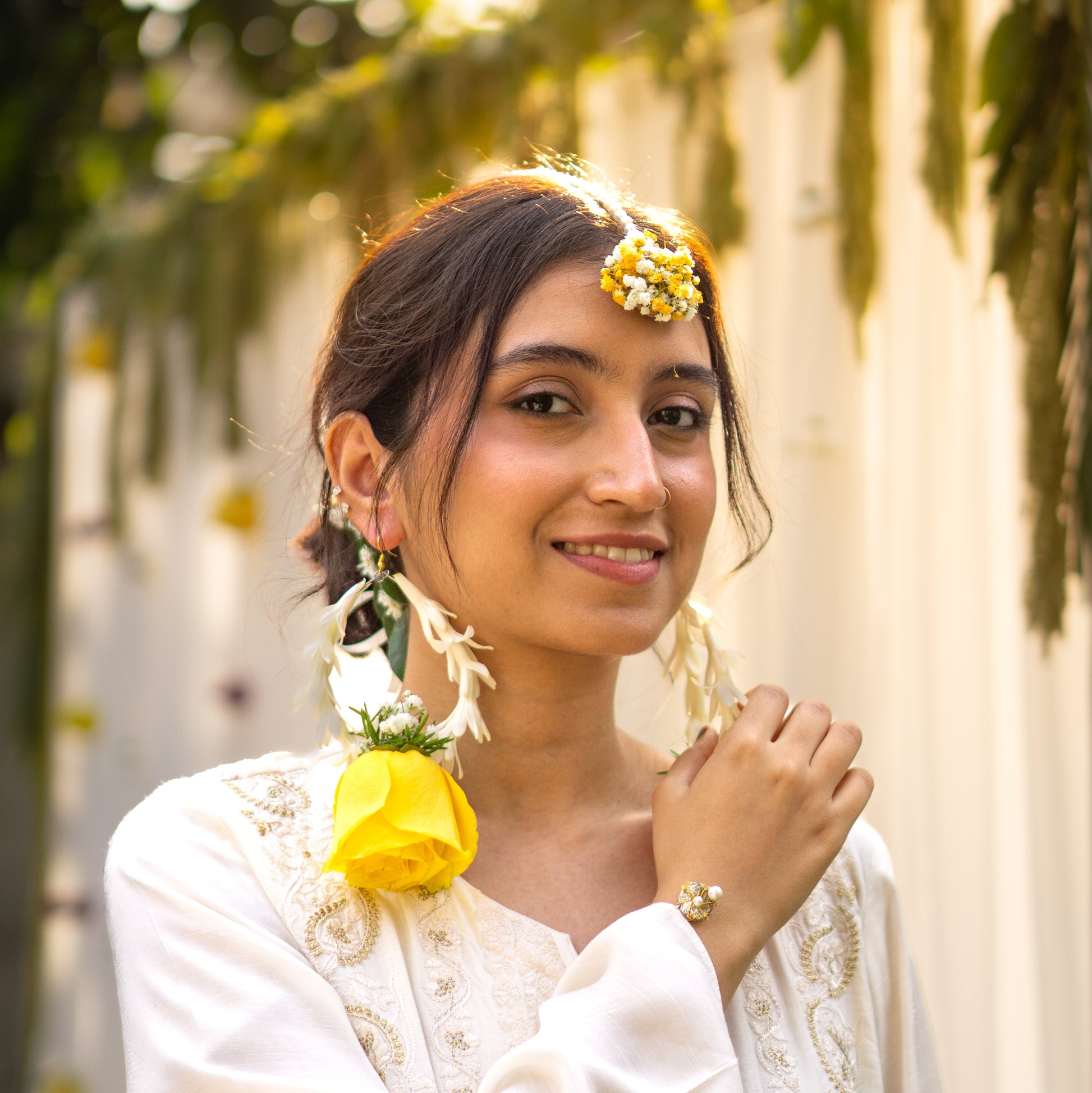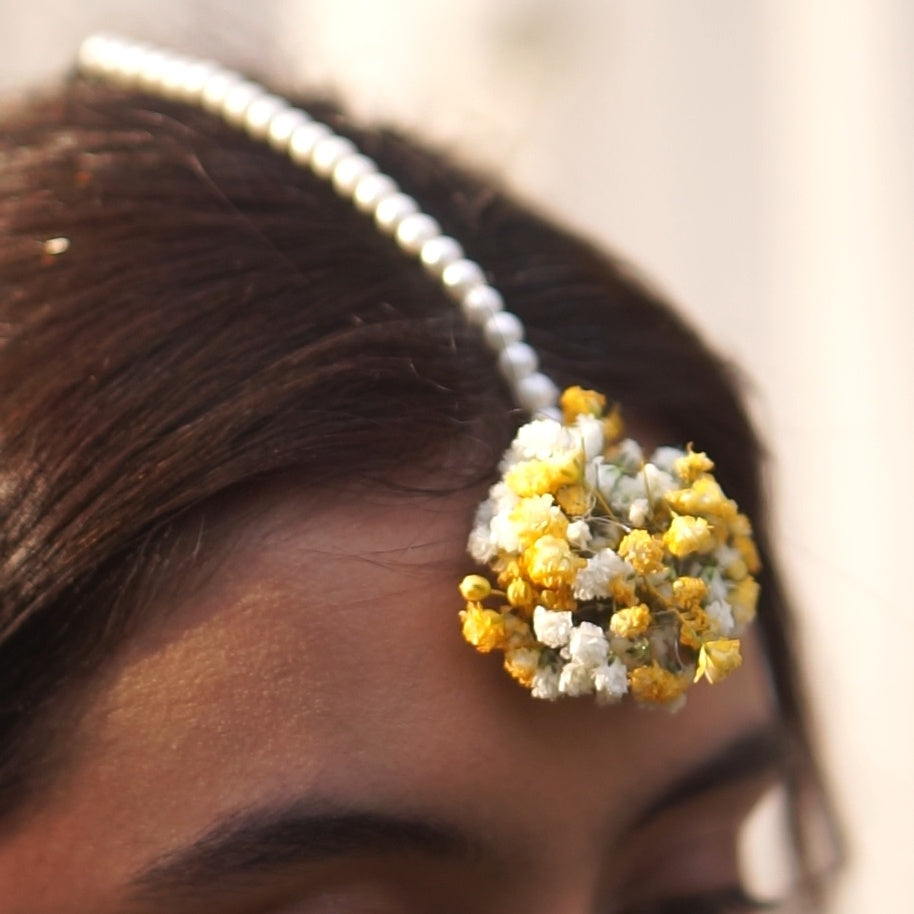 A radiant handcrafted adornment designed to brighten any look with elegance and charm. The earrings feature lush yellow roses paired with fragrant white tuberose, creating a soft yet striking floral silhouette. Complementing them is a delicate tikka crafted with yellow blooms, airy white baby’s breath, and lustrous pearls, adding a graceful touch of refinement.